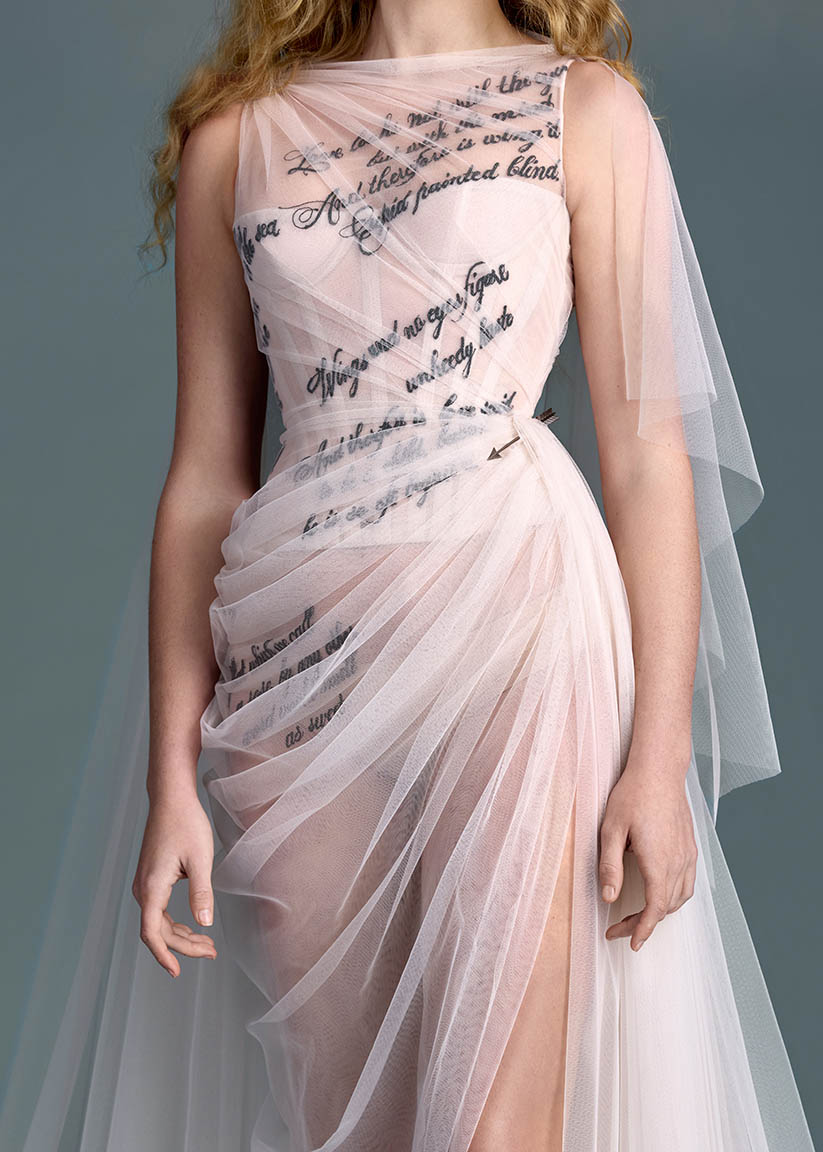 Previous PostNext Post A Lover’s Kiss LOOK – PSAW2504 Corset gown with sheer draping featuring embroidered Shakespeare quotes, inspired by the passing of secret letters between lovers. Make an Enquiryback to gallery