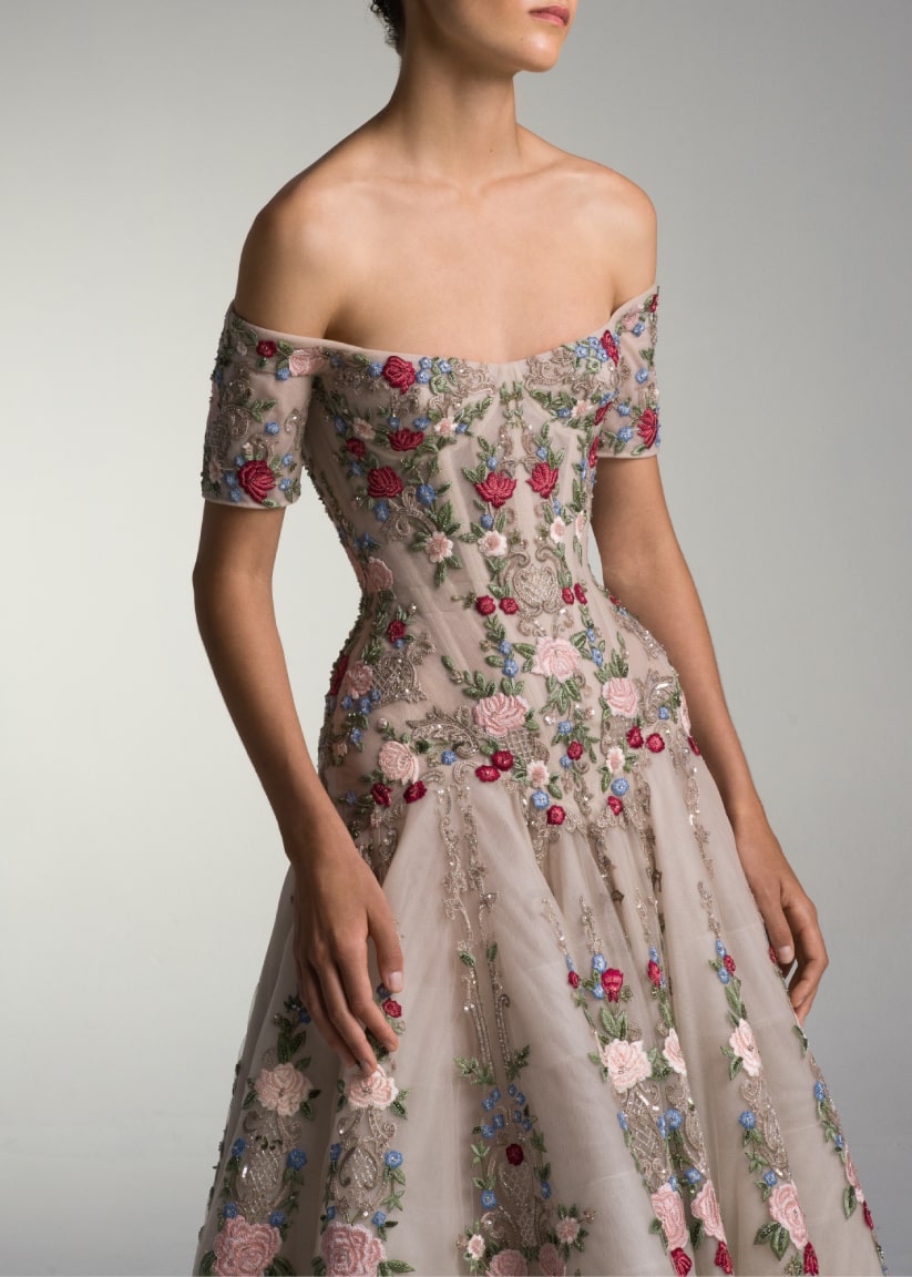 Previous PostNext Post ALLORA DOMENICA… LOOK – PSSS2407 Corseted off-shoulder drop waist gown with floral embroidery, in honour of the ceramic flower vase in Nonna Domenica’s salotto. Make an Enquiryback to gallery