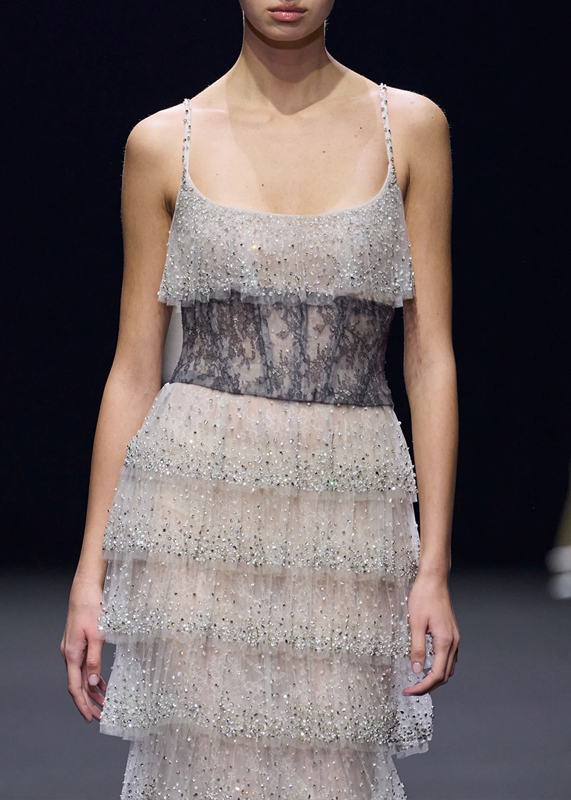 Previous PostNext Post POLVERE DI STELLE LOOK – PSSS2506 Tiered French Chantilly lace gown with degradé embellishment and lace corset. Make an Enquiryback to gallery